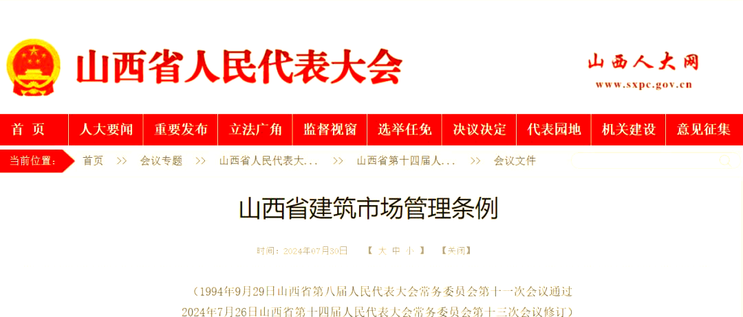 《山西省建筑市场管理条例》经山西省第十四届人民代表大会常务委员会第十三次会议于2024年7月26日修订通过,并自2024年10月1日起正式施行。